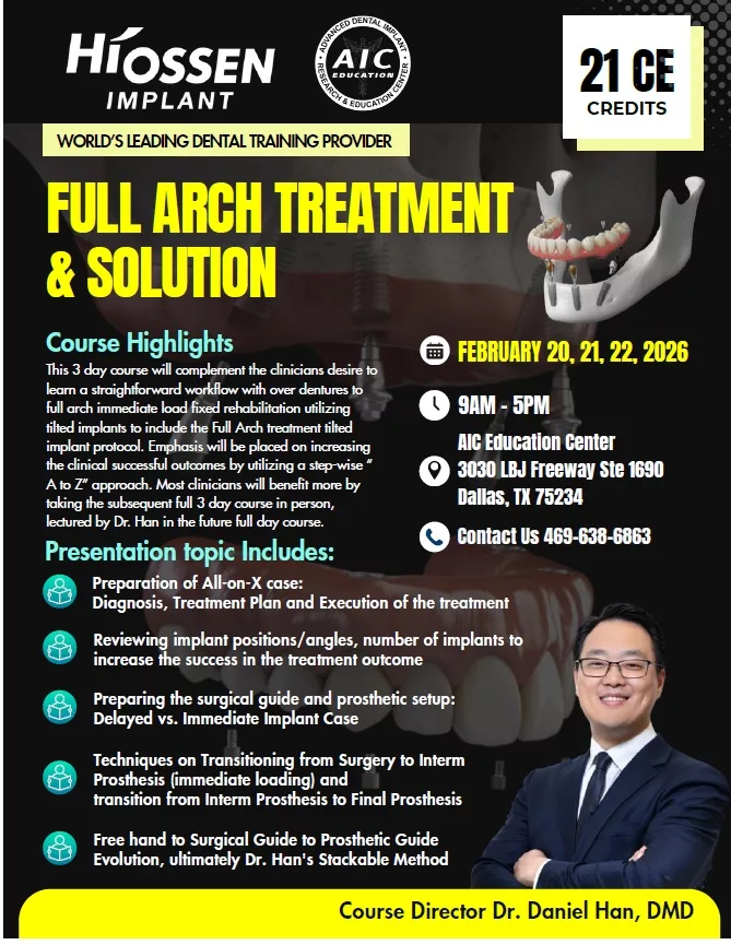 Full Arch treatment tilted implant protocol. Emphasis will be placed on increasing the clinical successful outcomes by utilizing a step-wise “ A to Z” approach.