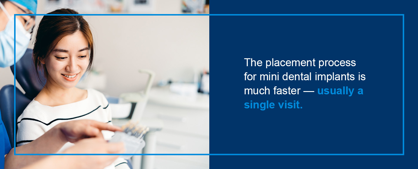 - The placement process for mini dental implants is much faster — usually a single visit.