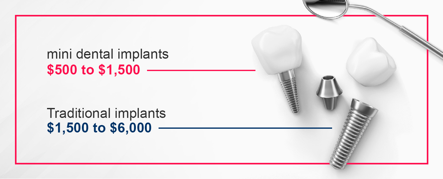 - Mini dental implants are usually much less expensive — costs vary, but on average, mini dental implants range from about $500 to about $1,500, while traditional implants fall somewhere in the $1,500 to $6,000 range.