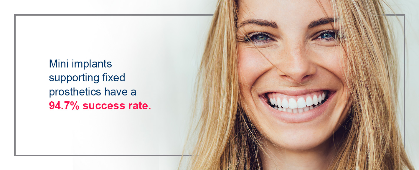 The success rate for mini dental implants is generally excellent. One retrospective analysis of 5,640 implants placed over a 12-year period found mini dental implants had a 92.1% success rate. Additionally, implants supporting fixed prosthetics demonstrated a 94.7% success rate, compared to removable prosthetics, with an 88.4% success rate.
