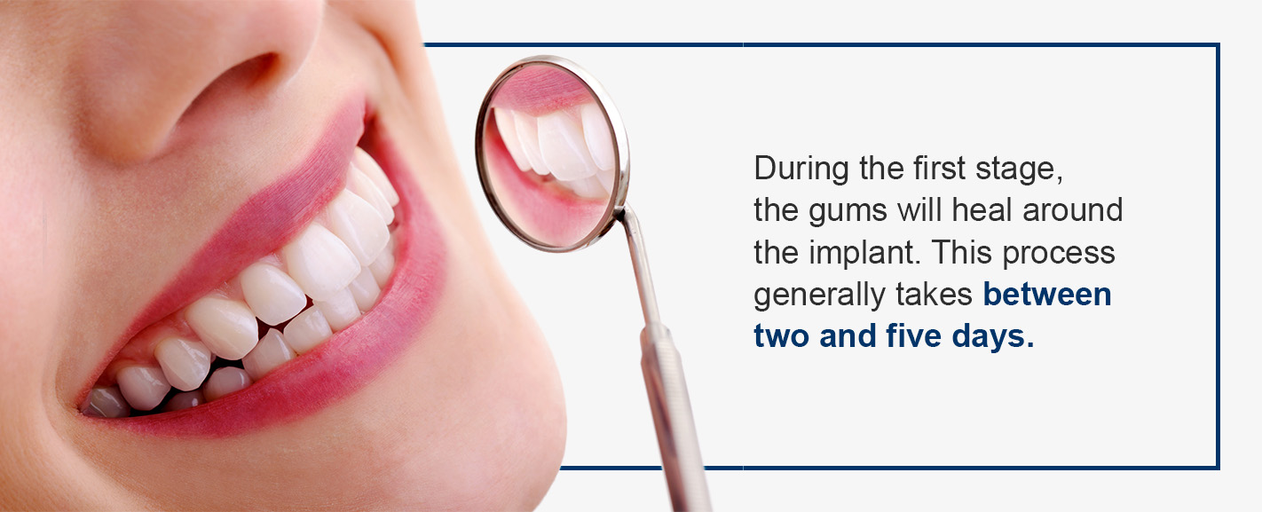 - During the first stage, the gums will heal around the implant — something you can see and feel happening. For an average, healthy adult, this process generally takes between two and five days.