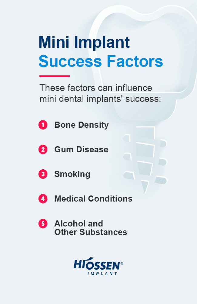 Of course, you’ll need to discuss your unique circumstances, including any risk factors, with your oral surgeon or dental professional. Only they can give you an accurate and honest assessment of your chances for success. What factors can influence mini dental implants’ success rate, aside from the ones listed above?